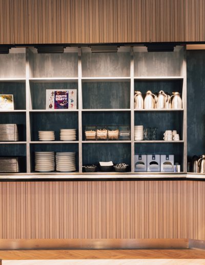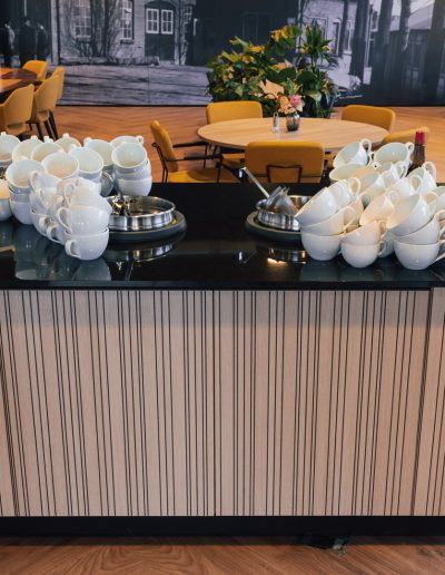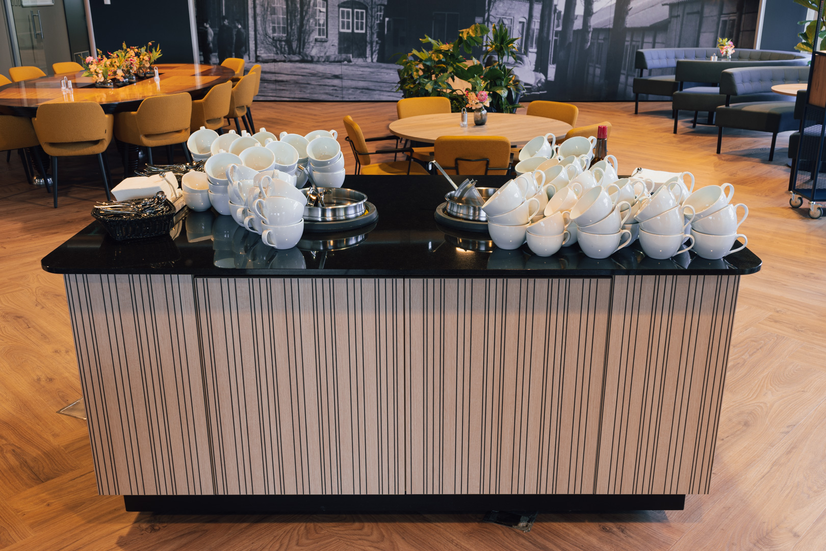 Advies: Ik maakte een nieuwe flexibele indeling met nieuwe tafels en stoelen, de bar werd gerestyled en er werd een stuk aangebouwd. Ik ontwierp een apart verrijdbaar soepbuffet, de vloer werd vernieuwd en er kwamen in-between-gordijnen en nieuwe lampen. Het plafond boven de keuken en de bar werd vervangen door een akoestisch systeemplafond.